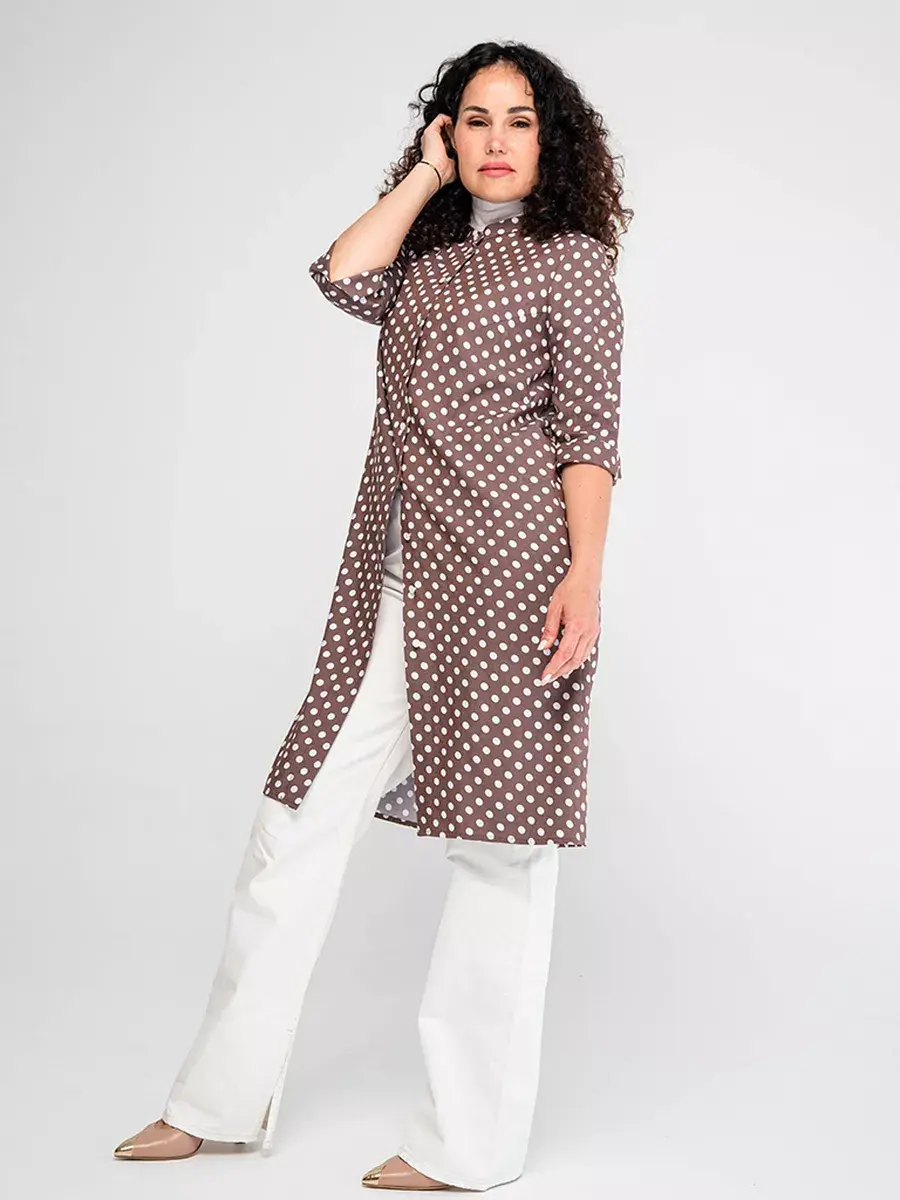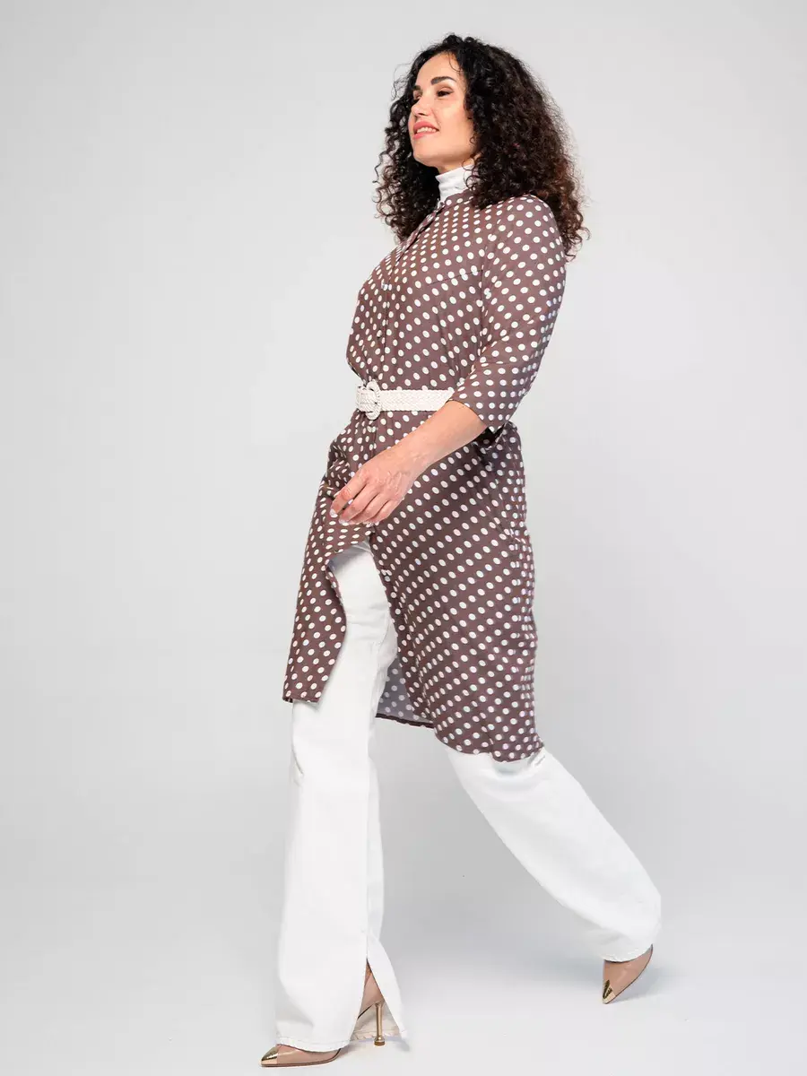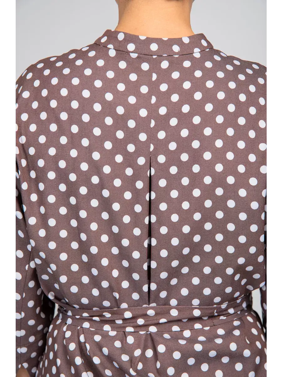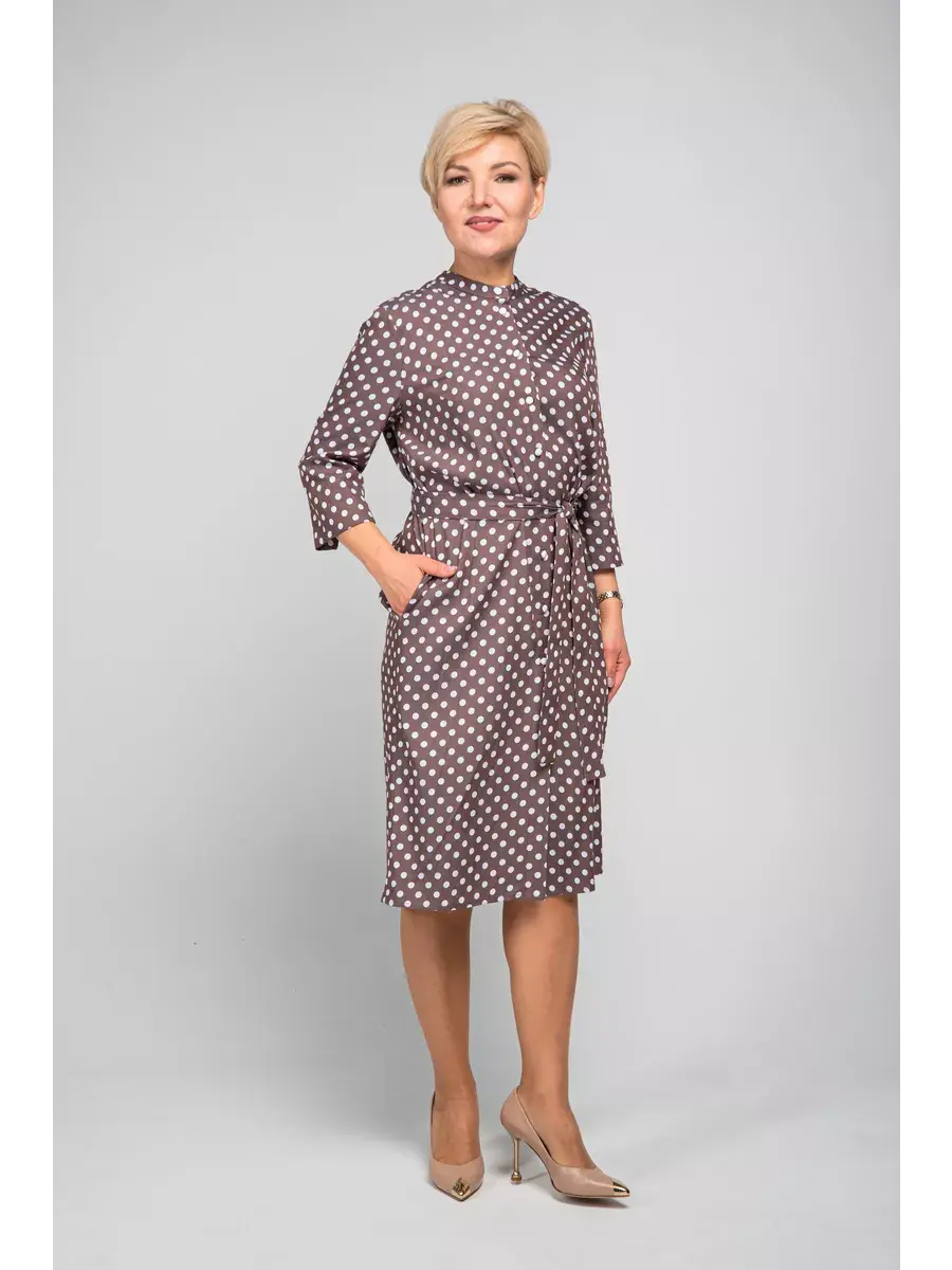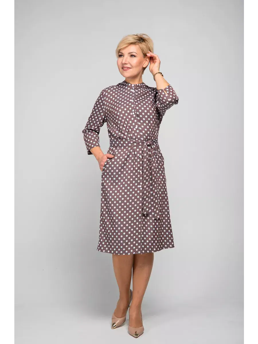 Наше модное платье-рубашка в горошек длины миди - базовая классическая одежда. Оно обладает универсальным дизайном, который позволяет создавать множество стильных образов в вашем гардеробе, от делового до свободного, от офисного до спортивного, от коктейльного и для вечеринки до нарядного, домашнего. Платье коричневое в горошек полуприлегающего силуэта подойдет для любого случая жизни, всех типов фигуры и женщин всех возрастов. Воротник стойка и ряд пуговиц по всей длине визуально вытягивает силуэт, имеет форму футляра. Ткань - качественная вискоза с добавлением лайкры, не уступает по комфорту хлопку. Натуральный состав ткани вы сразу почувствуете приятным прикосновением к телу прохлады и шелковистости, прекрасно подходит на весну и лето. Как и хлопковая ткань приятна на ощупь, легкая и обеспечивает максимальный комфорт во время носки. При этом не мнется и не теряет своей формы. Длинный рукав ¾ с отворотами, которые можно не подворачивать. Пояс на талии подчеркнет ее и создаст визуальный эффект тонкой талии. Французская длина юбки добавляет шарма и статуса. Коричневое платье-халат также оснащено удобными карманами в боковых швах, что делает его идеальным выбором для повседневного использования и стильного делового образа. Удобная застежка на пуговицах позволяет распахнуть его как халат, носить как домашнее ,оно станет находкой для кормящих мам. Прямой классический фасон коричневого цвета в белый горох позволит визуально уменьшить большой размер полным девушкам. Также платье актуально для худеньких подростков, как молодежный стиль оверсайз. Свободное по линии талии без пояса, подойдет беременным женщинам. Расцветка в горошек создает элегантный вид леди или винтажный, выделит из толпы, благодаря контрастному яркому сочетанию. Вечернее праздничное платье подходит и для особых случаев-различных мероприятий, включая вечерние выходы, корпоративные вечера, вечеринки, свадьбы, выпускной, никах, крестины, торжество, свидание. Отлично для прогулок, на курорте в отпуске
