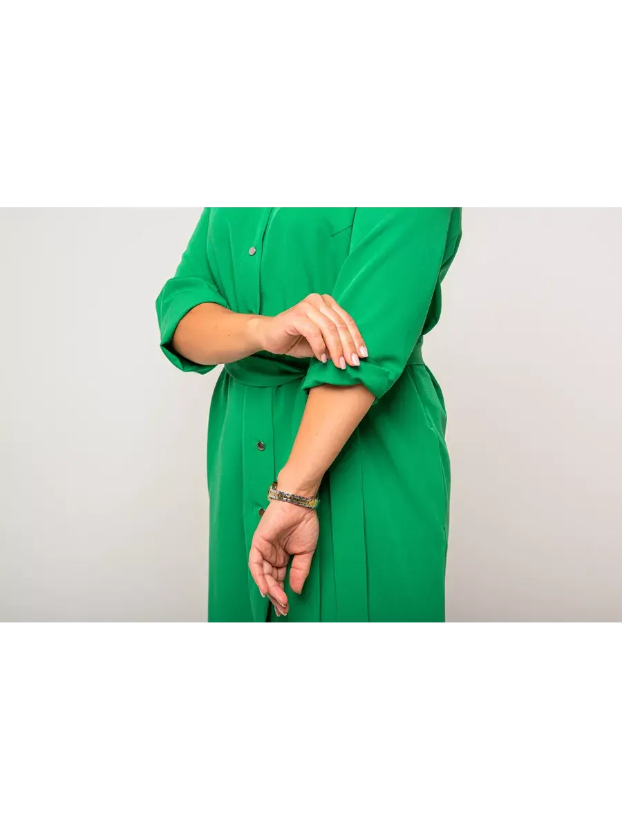 Каждая деталь продумана. Фурнитура не просто украшает – она играет роль ювелирного изделия на этом произведении моды. Модный зеленый травяной цвет придает свежести и актуальности образу, а карманы и пояс сочетаются с удобством халата.